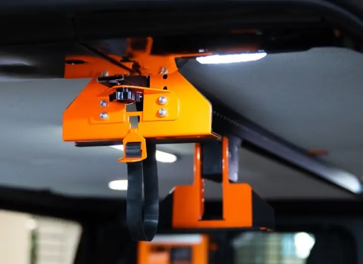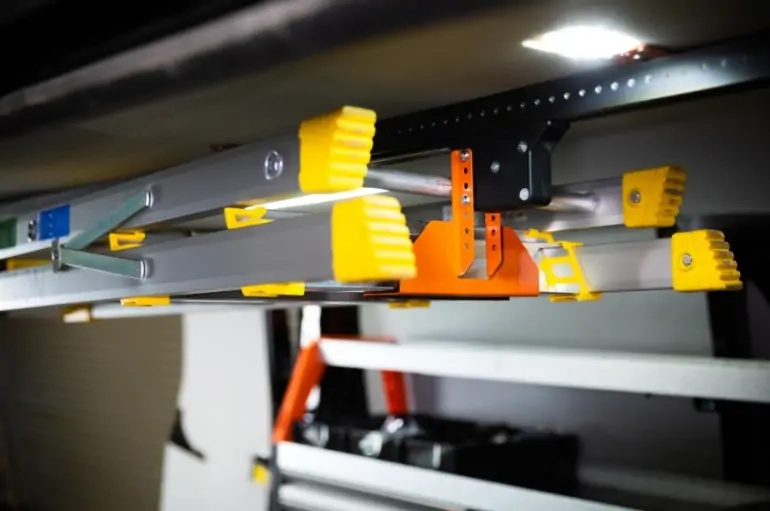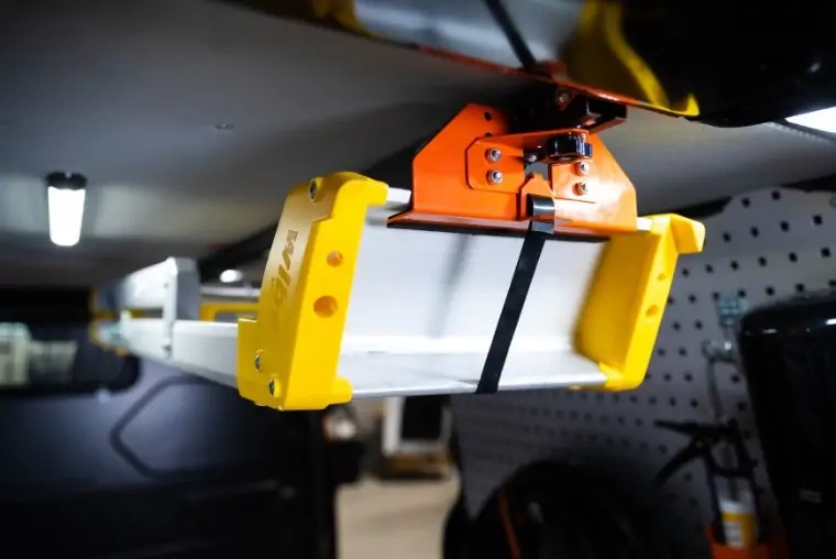 Gagnez de la place au sol et gardez votre échelle à portée de main avec ce porte-échelle intérieur monté au plafond de votre véhicule. Son ressort de maintien bloque l’échelle en position pendant le transport et facilite la sortie / remise en place au quotidien. Lorsque vous ne transportez pas d’échelle, orientez les supports pour qu’ils ne gênent pas le chargement.
